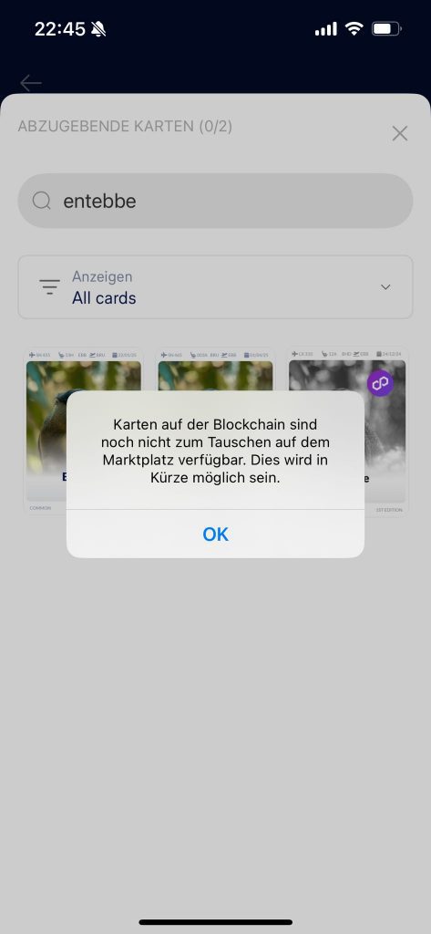 - Synchronisationsprobleme: Auf NFT-Börsen erworbene Karten erscheinen teils nicht in der App. Uptrip kennt das Problem, eine Lösung gibt es nicht. Meist wird per Kulanz eine „normale“ Karte ergänzt.